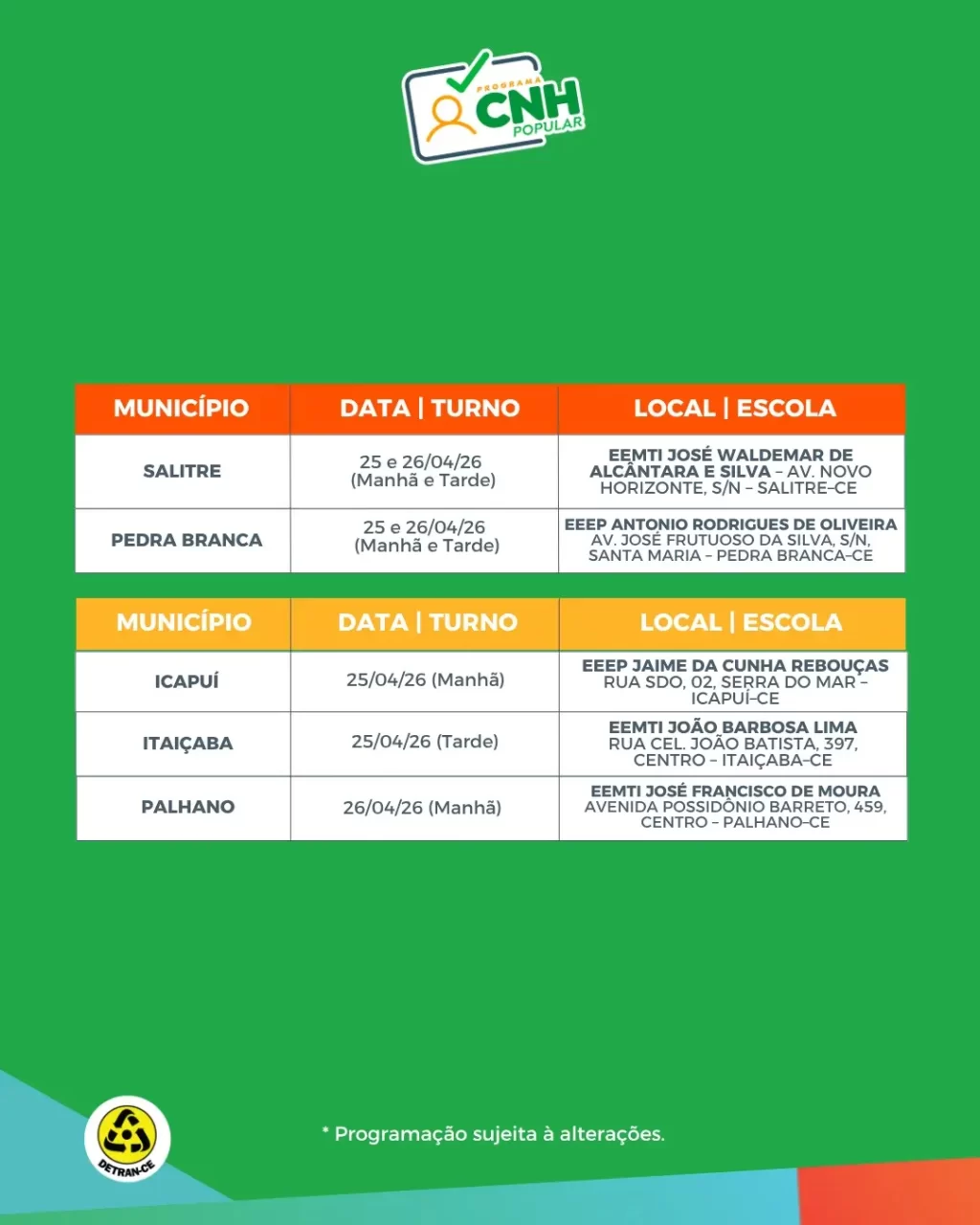 O programa CNH Popular, do Departamento Estadual de Trânsito do Ceará (Detran-CE), realiza novos atendimentos neste fim de semana em cinco municípios do interior do estado. A ação ocorre neste sábado (25) e domingo (26) e é voltada aos candidatos aprovados na edição 2025 do programa.